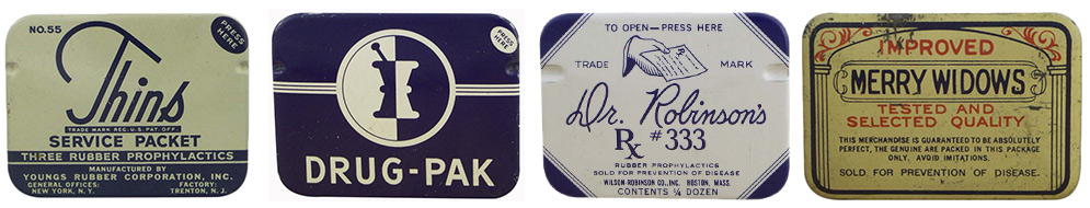 Three early condom tins rely on subtle cues to convey their contents’ usage. Courtesy Dittrick Medical History Center, CWRU.